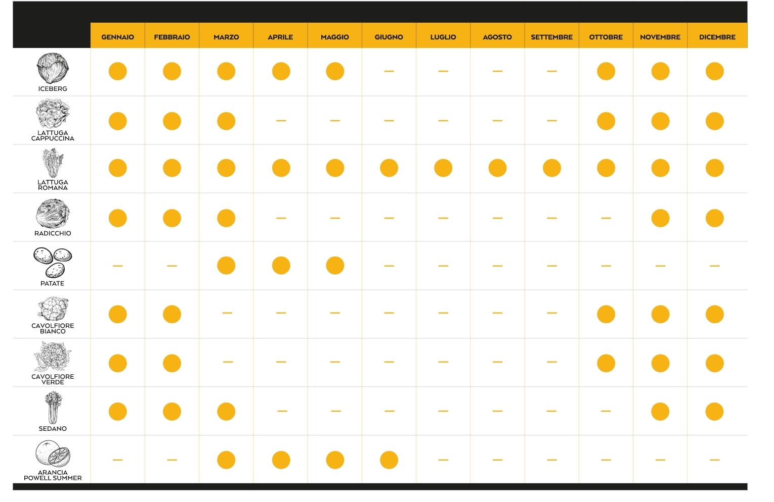 Lattuga Iceberg Siciliana, Lattuga Cappuccina, Lattuga Romana, Radicchio Tondo, Patata Novella di Siracusa, Cavolfiore Bianco, Cavolfiore Verde e Arancia Powell Summer: sono queste le eccellenze della terra siciliana protagoniste della nostra gamma.